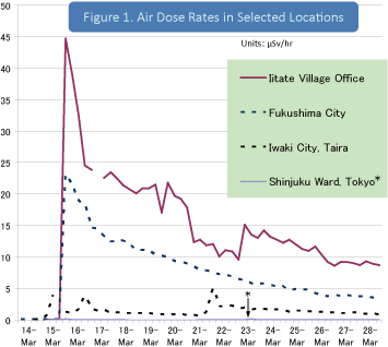 Each prefecture has also published air dose rates (see Figure 1). Looking at the figures for Fukushima Prefecture, the peak was 44.7 Sv/hr (microSieverts/hour) in the area of Iitate Village outside the 20 km evacuation zone. Even at Fukushima City, 60 km from the accident site, the dose rate exceeded 20 Sv/hr. In Tokyo, 0.2Sv/hr were detected; too small a value to show in the figure, but several times larger than normal. Since the value would normally be less than 0.1 Sv/hr, this shows that extremely high values were observed in areas downwind from the accident site.