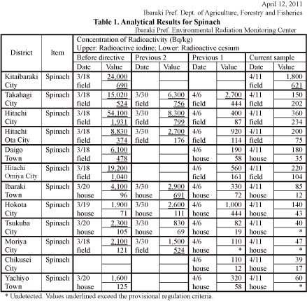 Radioactivity released into the environment not only affects the atmosphere (see bottom of the left-hand column on p.7), but also results in pollution of the soil and various kinds of food and drink. The Ministry of Health, Labour and Welfare (MHLW) has released the results of a strengthened observation system. One example of this is shown in Table 1, below. Provisional regulation criteria have been set for radioactive iodine and cesium, samples taken and studied, and distribution of produce found to exceed the criteria has been prohibited.