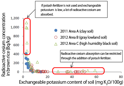 Graph 3. Exchangeable potassium content of soil versus radioactive cesium concentration in brown rice (Ref. 3)