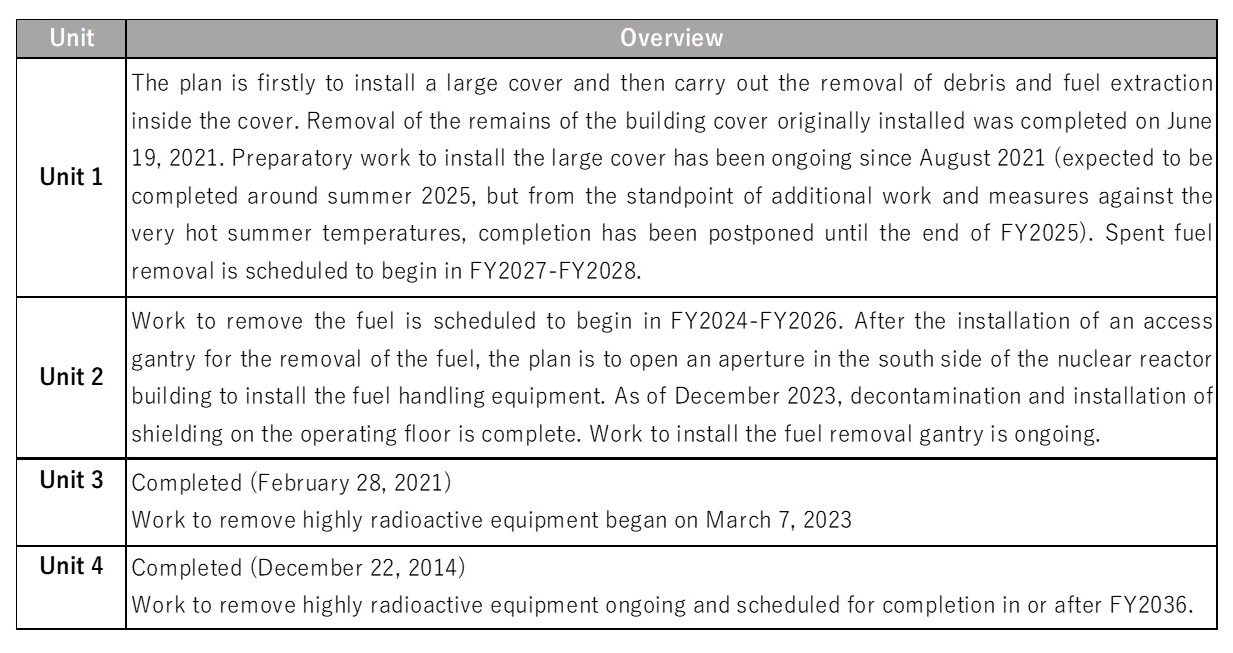 The state of removal of spent nuclear fuel from the SFPs is summarized in Table 1. Spent nuclear fuel removal from Units 3 and 4 has been completed. Preparations are now being made to remove the spent nuclear fuel from Units 1 and 2. Further, the transfer of spent fuel from Unit 6 to the common pool was completed on April 16 and the transfer of spent fuel from Unit 5 to the common pool was begun on July 23.