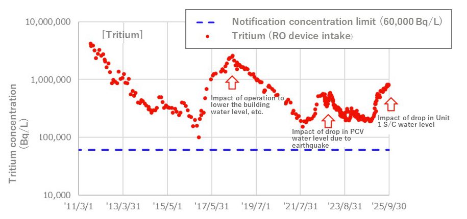 It is thought that the causes of this, which have occurred in association with the work to lower the water level in the suppression chamber (S/C) at the base of the Unit 1 reactor containment vessel, include a) the impact of relatively highly concentrated contaminated water leaking into the reactor building side and b) the reduction of rainwater and groundwater flowing into the reactor building due to countermeasures against contaminated water, thus reducing the dilution of contaminated water. Treated water with a tritium concentration exceeding 1 million Bq/L before dilution cannot be released under the implementation plan, but the concentration is now approaching this level and therefore requires careful observation.