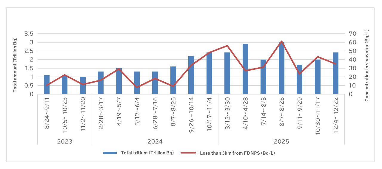 In the reduction of the toxicity of contaminated water, cesium and strontium are removed, and after the removal of impurities using a reverse osmosis (RO) membrane, the multi-radionuclide removal equipment (ALPS – Advanced Liquid Processing System) then removes 62 radionuclides. The water is then stored in tanks (containing 1,253,996m3 as of January 22, 2026. However, due to past equipment malfunctions and operational policies, around 64% of the stored water exceeds the notification concentration). Oceanic release of the ALPS-treated contaminated water began on August 24, 2023, a total of 133,321m3 being released in 17 batches by December 2025. The total released volume of released tritium for each release and the peak value of the concentration of tritium in seawater less than 3 km from FDNPS are shown in Fig.5.