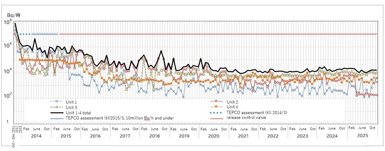 The water temperature in the containment vessels and the spent fuel pools (SFPs) shows no great variation despite seasonal temperature changes. The state of releases of Xenon-135 (half-life approximately nine hours), released when uranium fuel undergoes fission, is also unchanged and it can therefore be estimated that the state of the reactors is stable. Further, a maximum of around 15,000 becquerels per hour (Bq/h) of radioactive materials were being released to the atmosphere from the buildings (TEPCO assessment in August 2025, Fig.1).