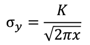 The stress is evaluated based on the stress distribution*10 near the tip of the crack, instead of the stress at the tip, where the stress is infinite. In-plane stress distribution σy(x) is known to be inversely proportional to x1/2, where x is the distance from the crack tip. It can be expressed as follows, with the proportionality coefficient K: