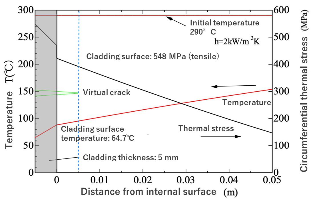 The stress intensity factor is calculated by the equation shown in F-3200 in Appendix F, “Stress Intensity Factor,” to JEAC 4206-2007. Assuming that there is cladding, I calculated the stress exerted on the cladding as well as the stress intensity factor according to the instructions in Appendix D to IAEA-TECDOC.*16