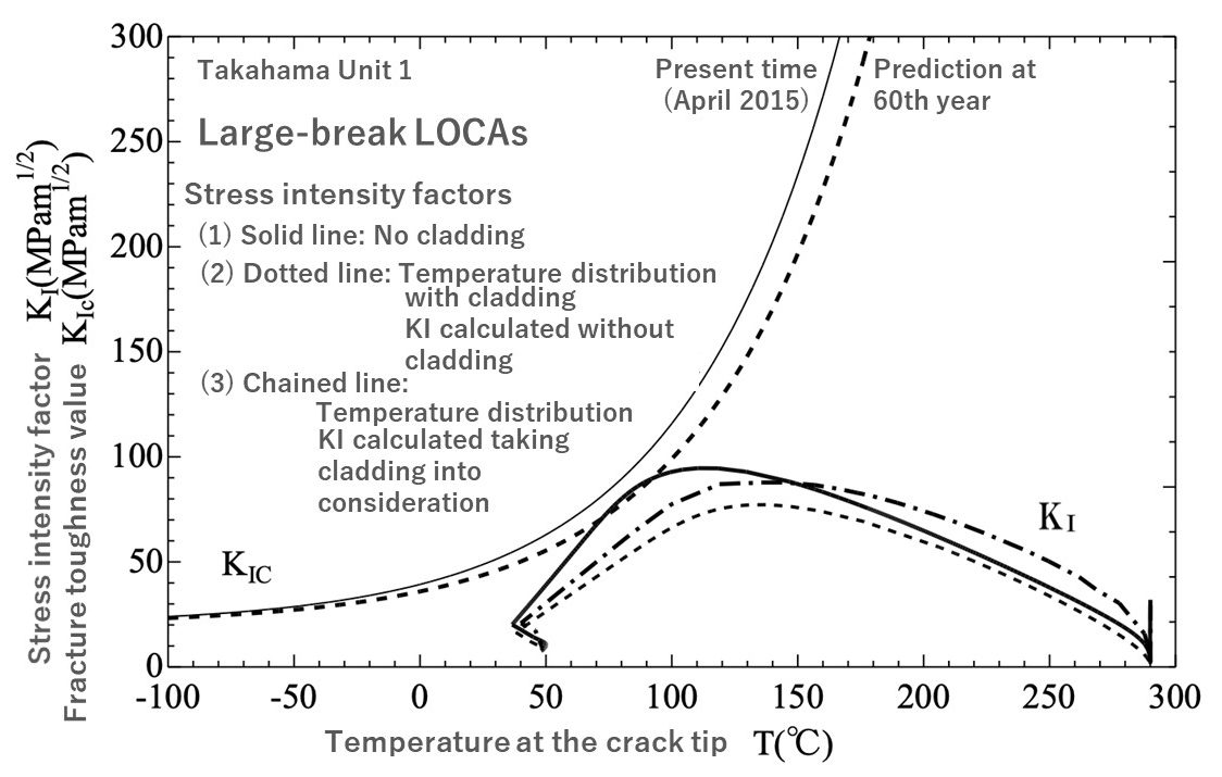 On the condition that there is no cladding, as in the solid line (1), the line shows a critical crossing with the fracture toughness value curve at the time of 60 years of age, while the dotted line (2) shows no critical crossing, indicating that KI is smaller. Thus it is no exaggeration to say that the temperature distribution determines stress distribution and stress intensity factor KI. Therefore, the operator’s method, where temperature changes were made smaller by considering cladding in the temperature distribution calculation and thus lowering stress distribution and KI, is highly malicious.