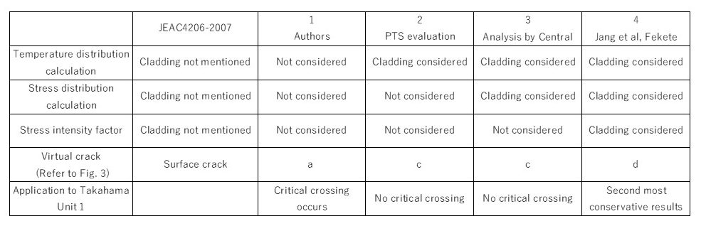 As the verdict mentioned, even if cladding is actually provided, assessment code JEAC 4206-2007 specifies a “surface crack” as an assumed failure, and it is against the code and unacceptable to consider a crack under the cladding as a subsurface crack such as that shown in illustration c) in Fig. 4. Further, if the fact that the cladding exists can be the ground for considering the cladding in thermal conduction analysis, it is unreasonable not to consider cladding in stress analysis. Because of this very reason, the analyses should be performed consistently without taking cladding into consideration. If cladding should be considered, stress analysis should also be performed by taking into consideration the stress in the cladding.