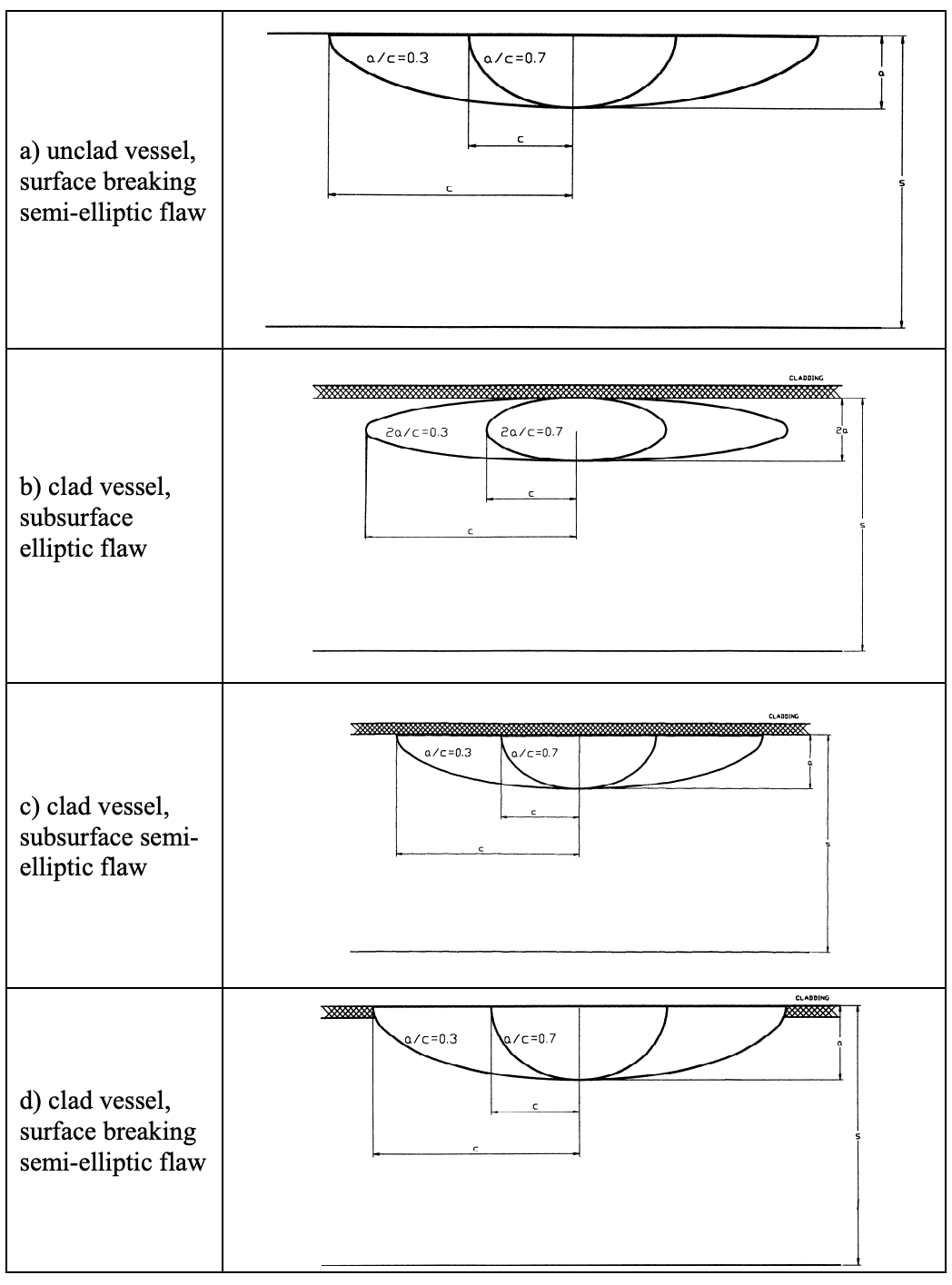 When there is cladding, two types of cracks are modeled: Illustration c) in Fig. 4 represents a crack under the cladding, and illustration d) in Fig. 4 shows a crack on the surface. In the regulatory code, such a crack is designated “surface crack” (as shown in illustrations a) and d) in Fig. 4).